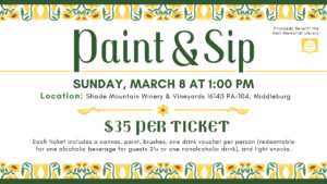 The Herr Memorial Library invites the community to a creative afternoon in support of the library at a Paint & Sip fundraiser on Sunday, March 8 at 1:00 PM, hosted at Shade Mountain Winery in Middleburg, PA.