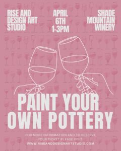 All pottery pieces will be fired and brought back to Shade Mountain Winery for pick up later that week. Pottery items will range in price from $20 – $55. Wine and snacks are available to purchase from Shade Mountain Winery.