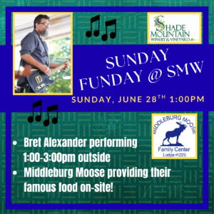 Stop by the winery for another of our SUNDAY FUNDAYS!! Crowd favorite, Bret Alexander will be performing some fantastic tunes outside on our deck (weather permitting) from 1:00-3:00pm.