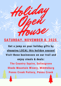Our Annual Progressive Holiday Open House held in conjunction with Penn’s Creek Pottery and The Country Squire is right around the corner! Kick off your Christmas shopping for the holiday season and enjoy steals & deals at our three local businesses!