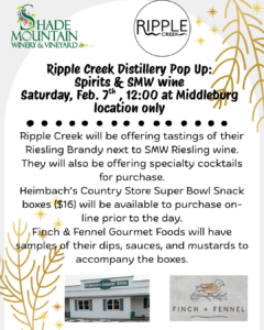 Our friends down the road are “popping by” to offer samples of their new spirit (crafted using our very own SMW Riesling wine): Ripple Creek Confluence (Riesling Brandy). Enjoy comparing their brandy to our Riesling….can you taste the similarities? They will also be featuring two signature cocktails made using their spirits for purchase.
