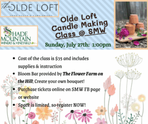 “Light” up your afternoon at Shade Mountain Winery & Vineyards by making candles under the tutelage of The Olde Loft candle crafters! The Team at The Olde Loft (Richard Road, Middleburg) have taken on the craft of candle making and are looking forward to imparting their expertise on to you!