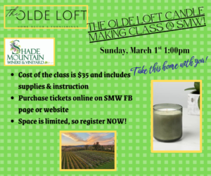 “Light” up your afternoon at Shade Mountain Winery & Vineyards by making candles under the tutelage of The Olde Loft candle crafters! The Team at The Olde Loft (Richard Road, Middleburg) have taken on the craft of candle making and are looking forward to imparting their expertise on to you!
